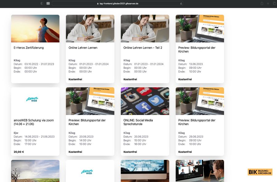 2026Aktuell können unsere Veranstaltungen via IFrame auf drite Webseiten ausgespielt werden, ohne dass direkt zum BiK verlinkt werden muss. Zukünftig werden wir dies über eine API lösen, so dass direkt die Daten ausgetauscht werde können. Denn wir glaube, das Bildungsmarketing zuküftig über Datenräume passiert und nicht mehr über starre Webseiten.