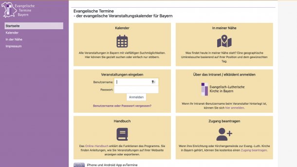 Evangelische Termine ist eine eigenständige Samelplattform, über die bereits verschiedene Veranstaltungswerkzeuge wie Kiribati oder Adebis angeschlossen sind. Betrieben wird es von der Evangelischen Landeskirche in Bayern.